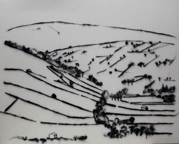 Ruth Packham's exhibition, Felt Places is inspired by the landscape of Ceredigion. She has photographed the scenery that is all around her and, using wool as her drawing material, needle felted the results on to cotton cloth. Each image has a minimal amount of visual information leaving the viewers' eye to fill in the gaps.