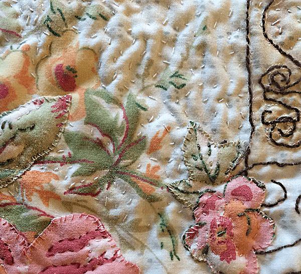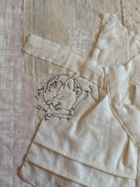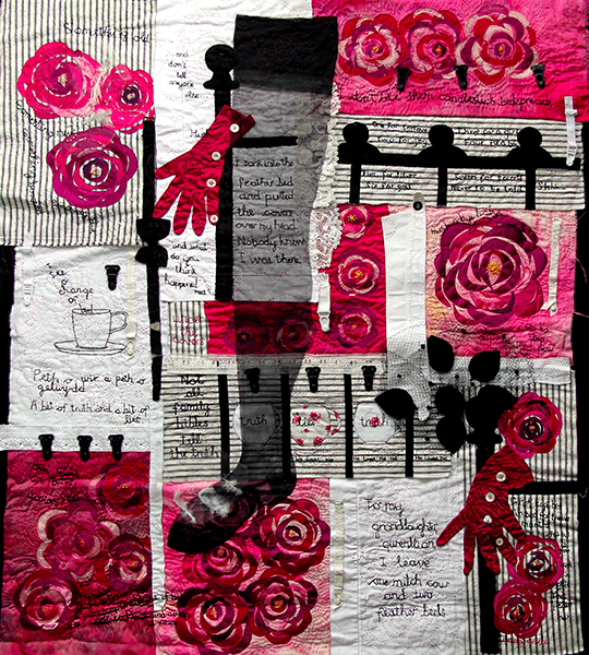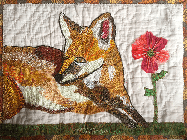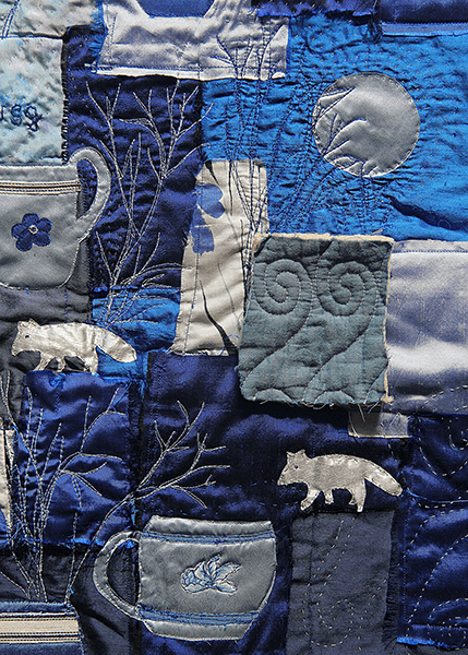 02 Textiles latest exhibition "Ar Hyd y Nos (All through the Night) takes its inspiration from small samples of Welsh quilts. Each member has chosen a piece of quilt and focused on colour, pattern, or quilting techniques as a starting point. While adhering closely to the night time theme, the group has diversified widely in its interpretation and subject matter. You will find moon gazing Hares, startled foxes, sleeping tramps, dreaming children, comfort blankets, vintage beds of roses, snuggled bed bugs, hooting owls and floating nighties - everything beneath the moon and the stars.
